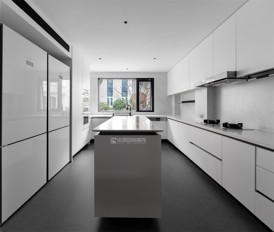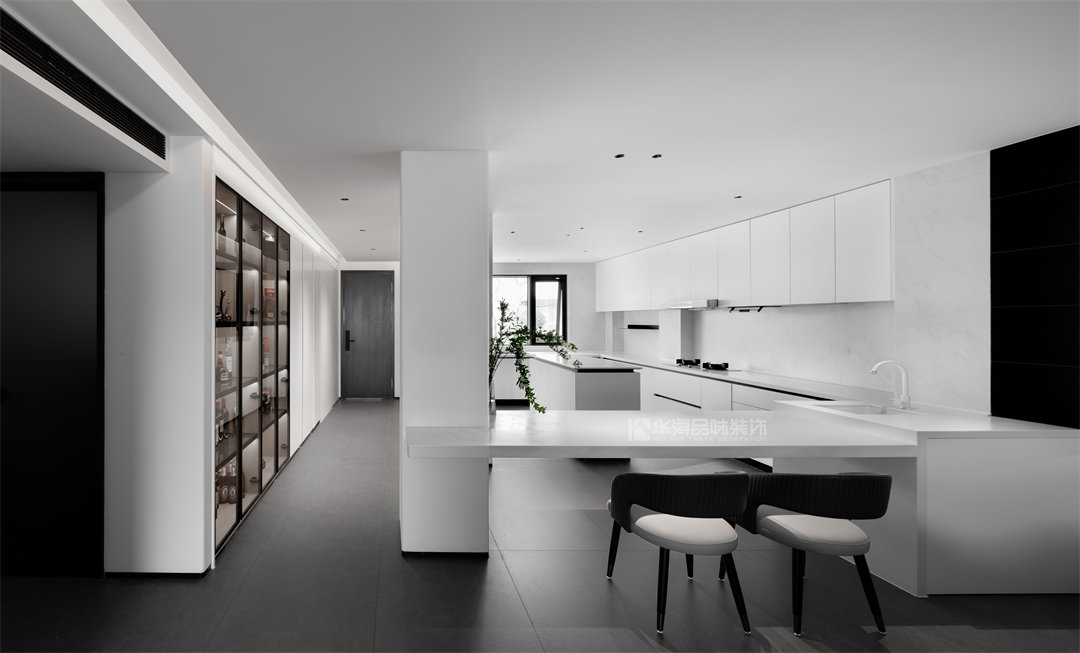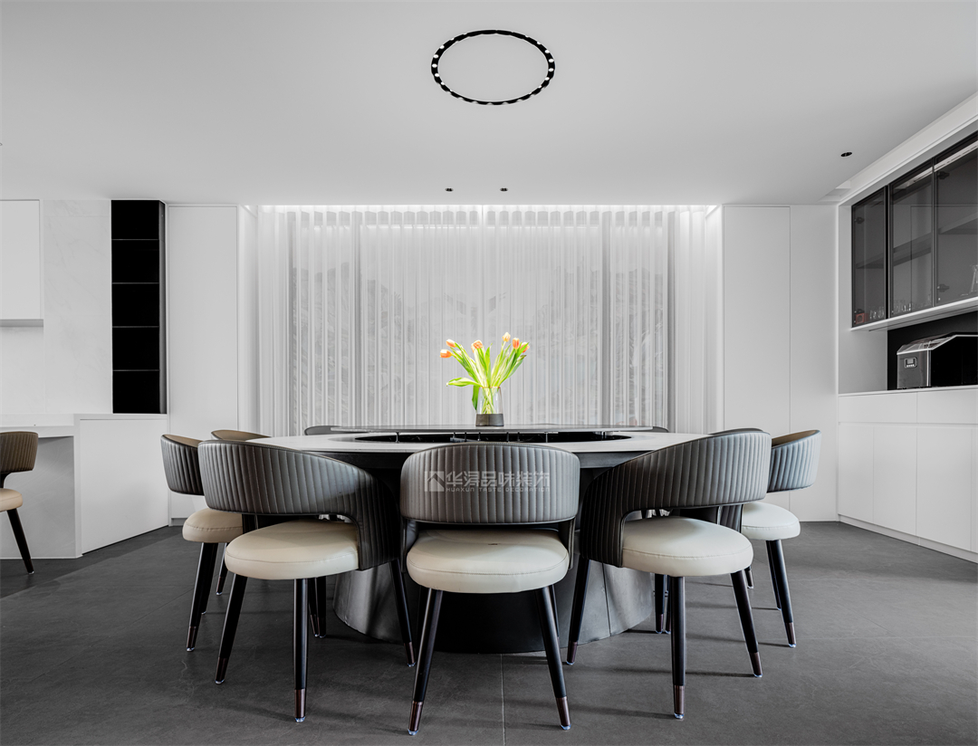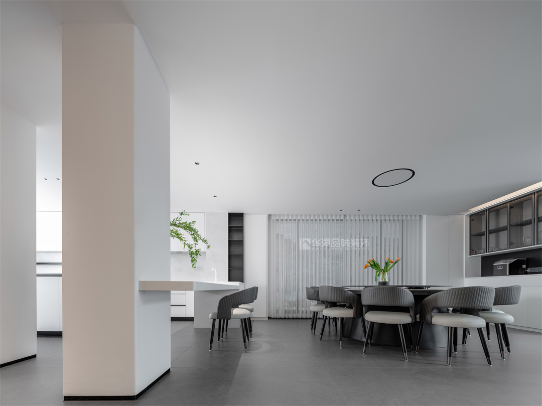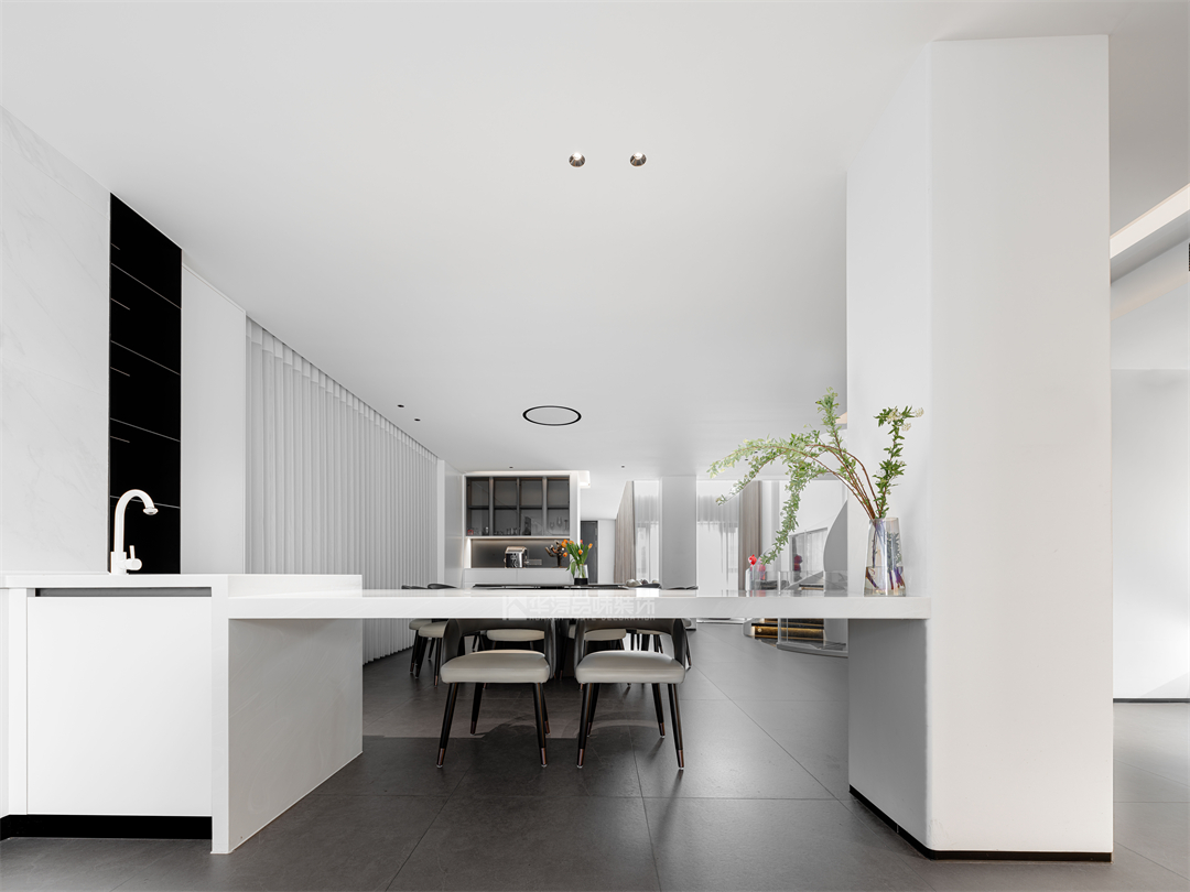 餐廳巧妙運(yùn)用穿插結(jié)構(gòu)設(shè)計(jì),聯(lián)通中西廚,不受隔閡地打造開放式的多維度場(chǎng)景,延續(xù)客廳的“白”,將人作為空間的主角,肆意游走的陽(yáng)光,協(xié)作的活力、美食的香氣、交談的溫情交織其間,美好生活,不止一面。