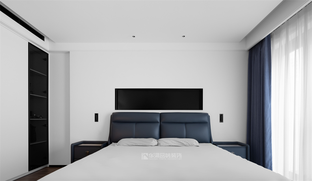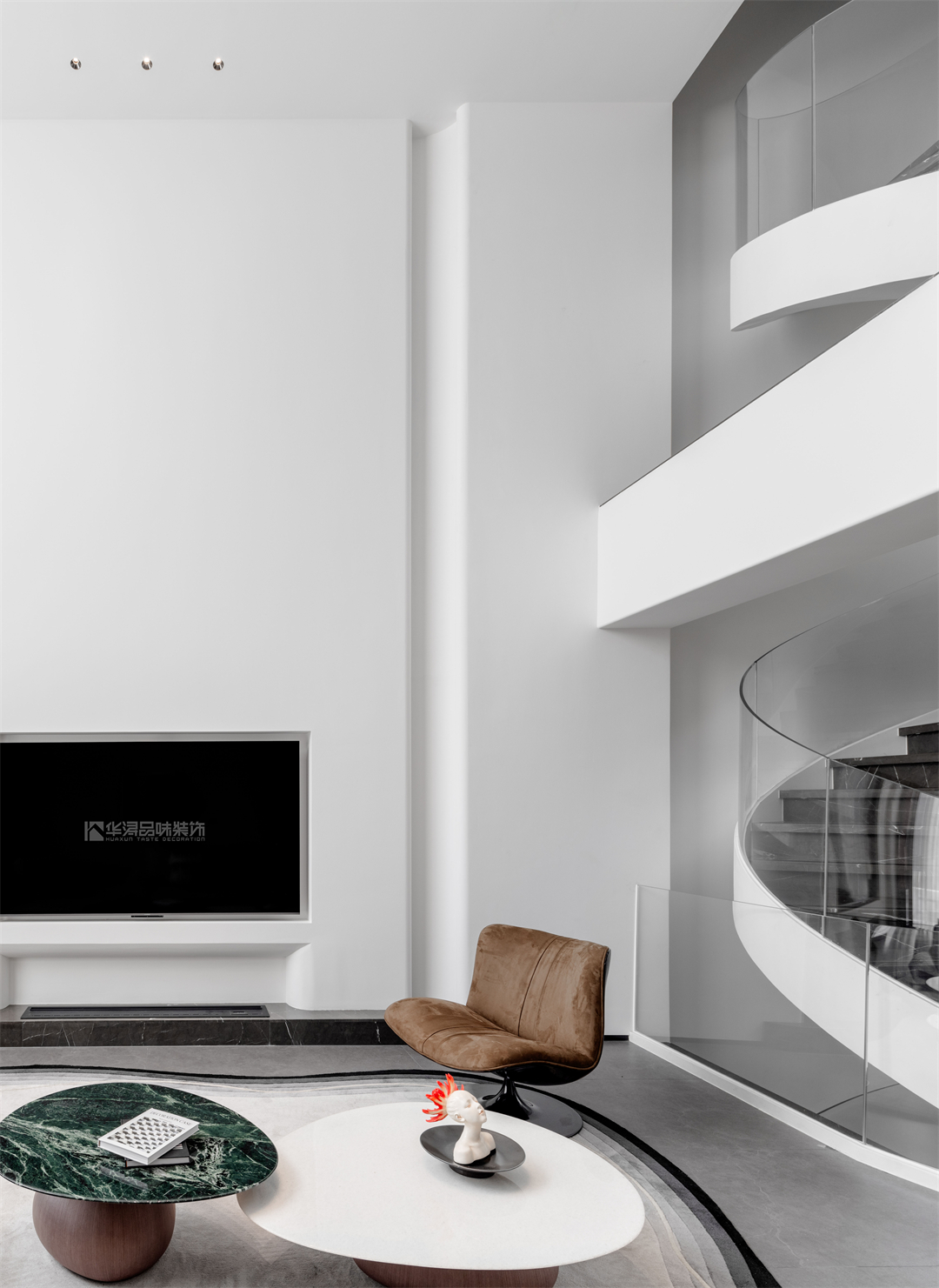 以“去繁就簡(jiǎn)”為核心,通頂?shù)碾娨暠尘皦Γ捎昧舭自O(shè)計(jì),無(wú)多余裝飾的純白基底如同畫布,將嵌入式電視穩(wěn)穩(wěn)托舉為視覺焦點(diǎn),下方的霧化壁爐以對(duì)稱布局呼應(yīng)電視主體,形成“上-下”視覺平衡。