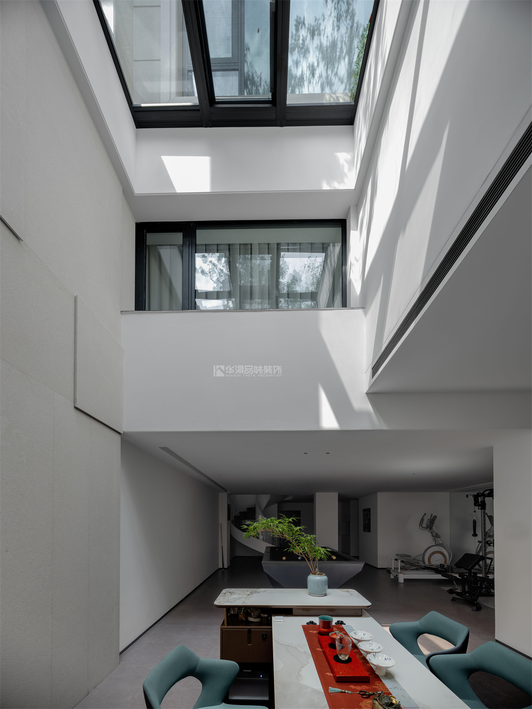 從停車場(chǎng)進(jìn)入負(fù)一層玄關(guān),秩序感與歸家的儀式感在此彰顯。自然光透過采光井灑進(jìn)室內(nèi),墻面光源設(shè)計(jì)豐富空間層次,消弭地下空間帶來(lái)的壓抑感。在此劃分品茗區(qū)、健身區(qū)及休閑娛樂區(qū),附以水景裝飾,有一種遠(yuǎn)離世俗喧囂、親近自然的靜謐與放松。