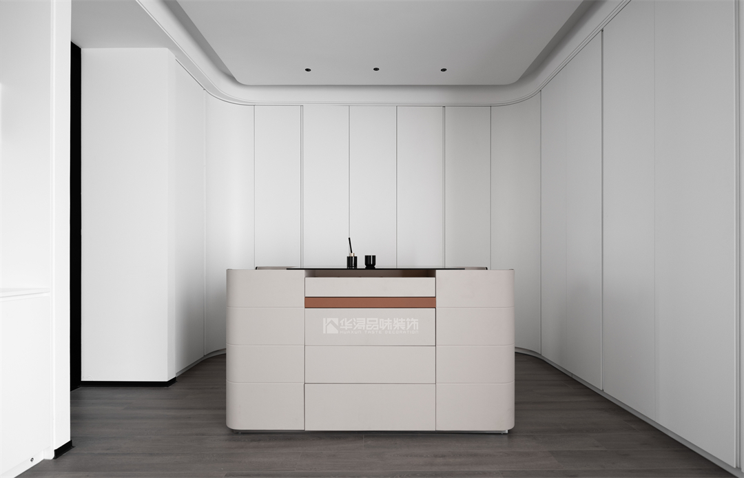 主臥衣帽間延續(xù)整體色調(diào),以流暢柔和的弧面線條勾勒出藝術(shù)感十足的造型,褪去了直角的冷硬與銳利,視覺上格外舒展雅致。采用全封閉衣柜與獨(dú)立島臺(tái)的經(jīng)典組合設(shè)計(jì),讓整潔有序不止停留在視覺層面,更滲透進(jìn)日常使用的每一處細(xì)節(jié),兼顧了美學(xué)質(zhì)感與生活實(shí)用性。